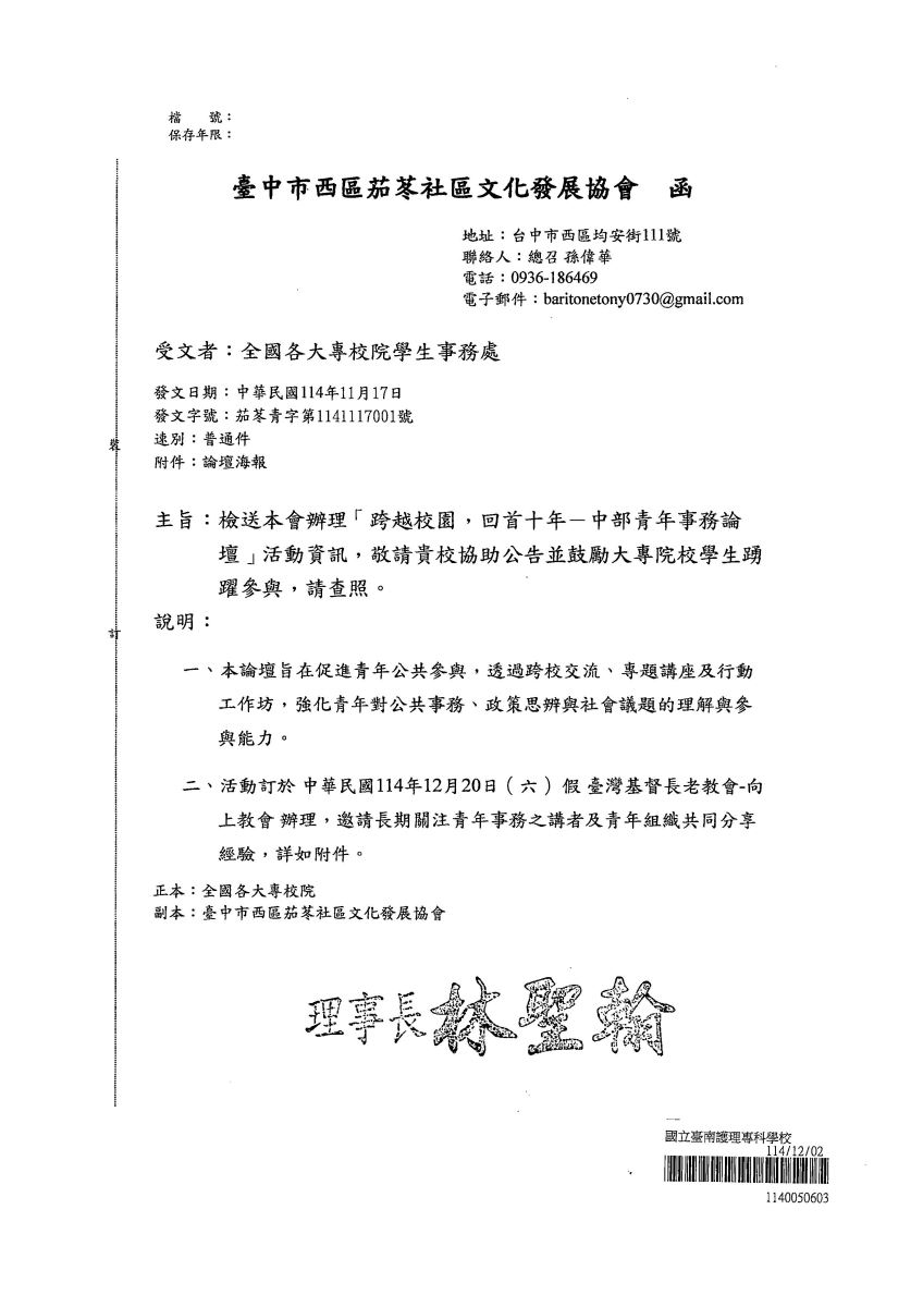 臺中市西區茄苳社區文化發展協會辦理「跨越校園,回首十年一中部青年事務論壇」