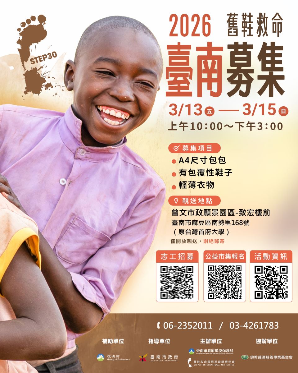 一、該會將於民國115年3月13日(星期五)至3月15日(星期日),假臺南市麻豆區曾文市政願景園區-致宏樓前廣場辦理「2026臺南舊鞋救命二手物資募集活動」。