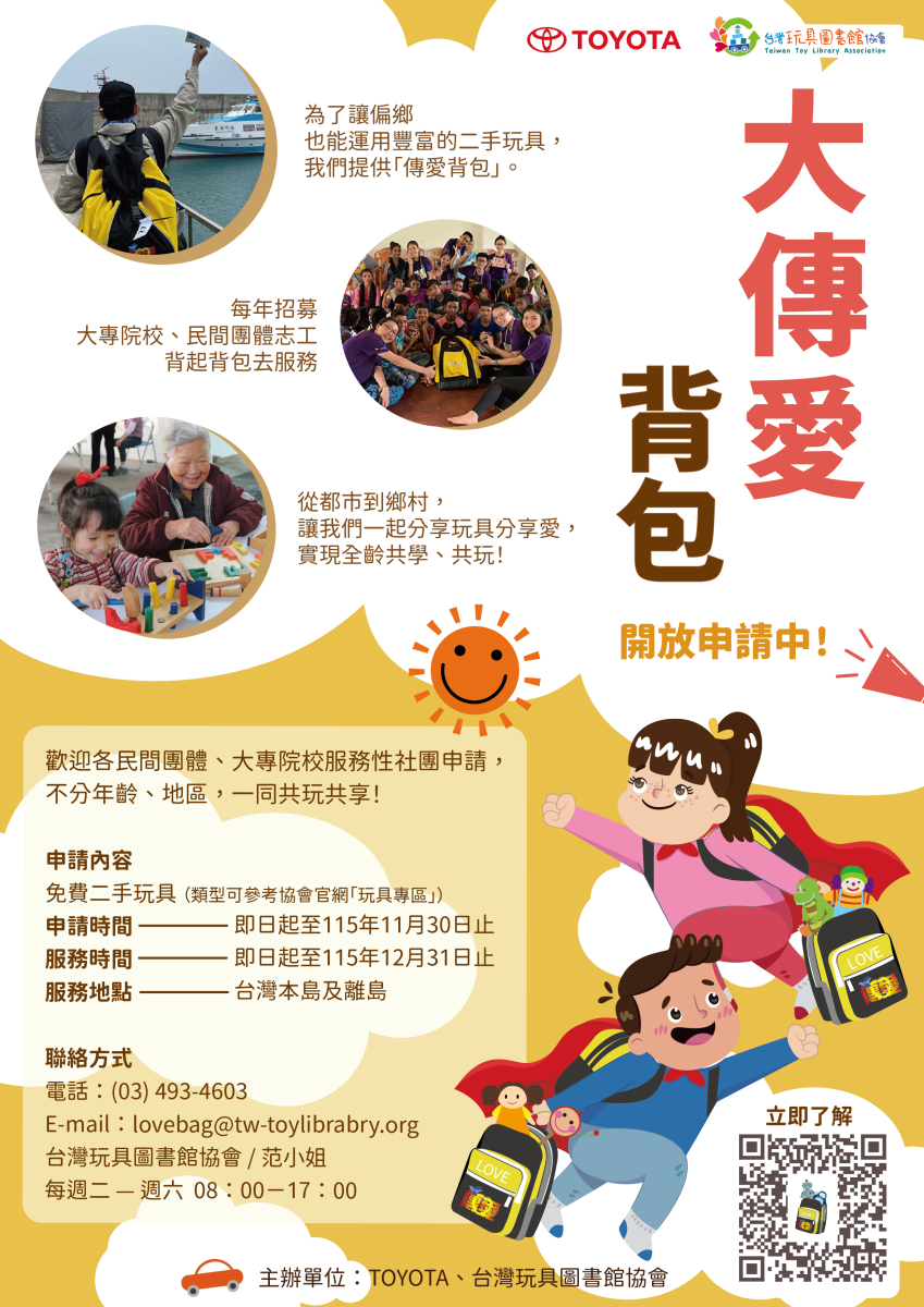 台灣玩具圖書館協會與TOYOTA企業合作辦理「2026年度大傳愛背包計畫」