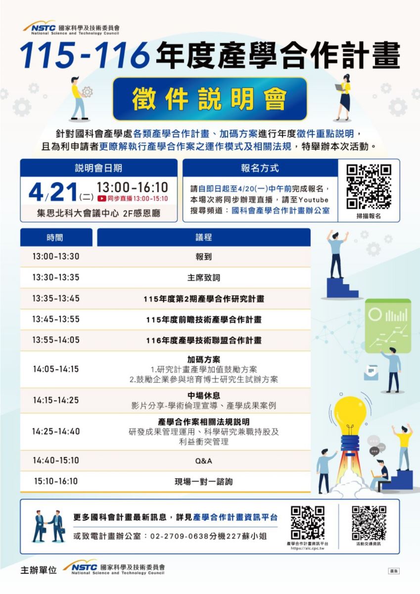 國科會訂於115年4月21日辦理「115-116年度產學合作計畫徵件說明會」