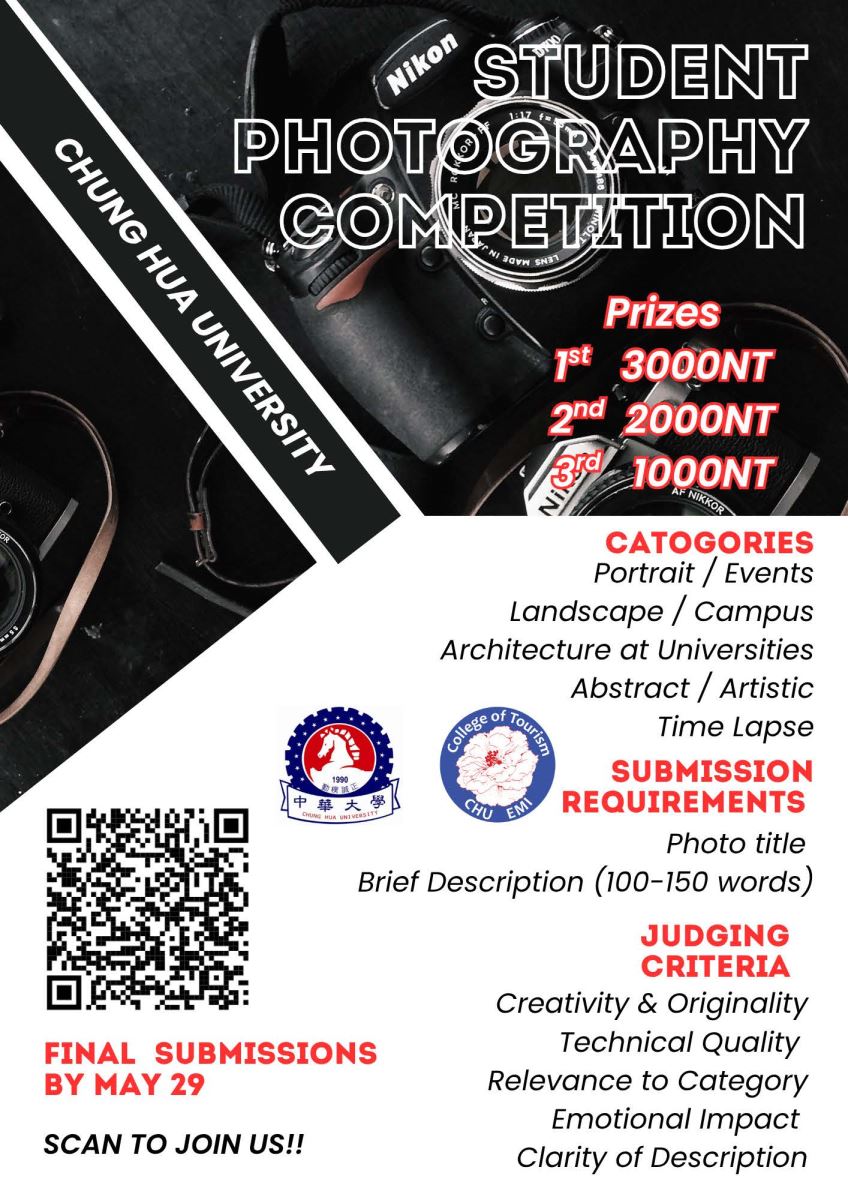 七、The English Total Immersion (ETI) and Chung Hua University Photography Competition invites students across Taiwan to capture and share the unique moments of university life. Combining photography with English, this contest encourages creative expression and meaningful communication through visual storytelling. Explore campus through themes such as portraits, landscapes, architecture, and artistic perspectives. Submit your work, share your vision and win a prize. Find out more and sign up here - https://x.chu.edu.tw/PRQTTR/
