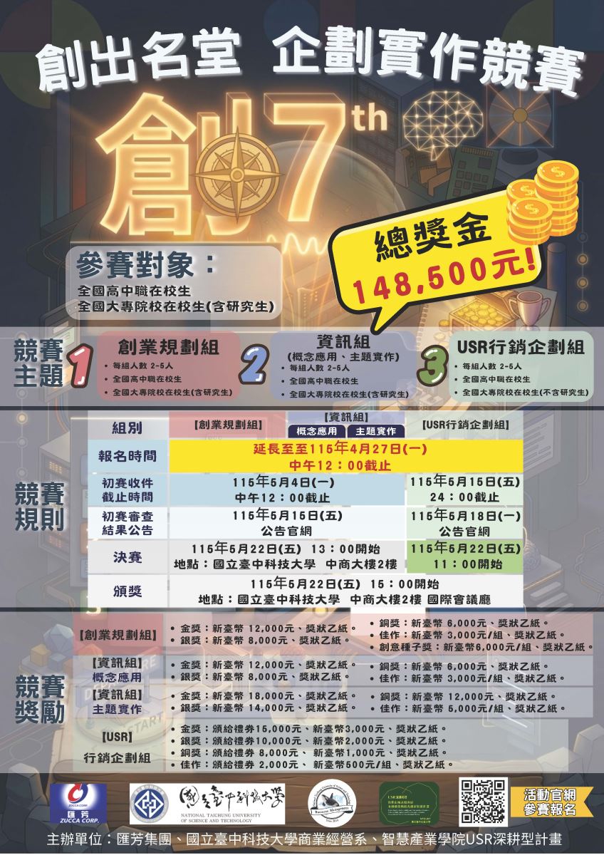 一、本競賽以「三創」為核心理念,強化創意、創異及創益三方面的綜合實踐力,分為【創業規劃組】、【資訊組】(概念應用與主題實作)以及【USR行銷企劃組】,總獎金高達148,500元。報名詳情請參閱附件或https://bm.nutc.edu.tw/p/426-1084-13.php。