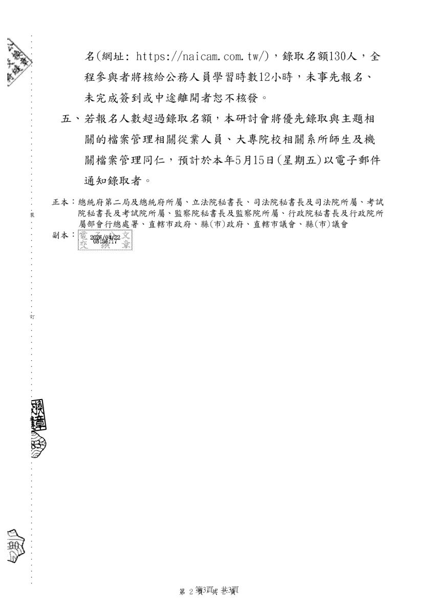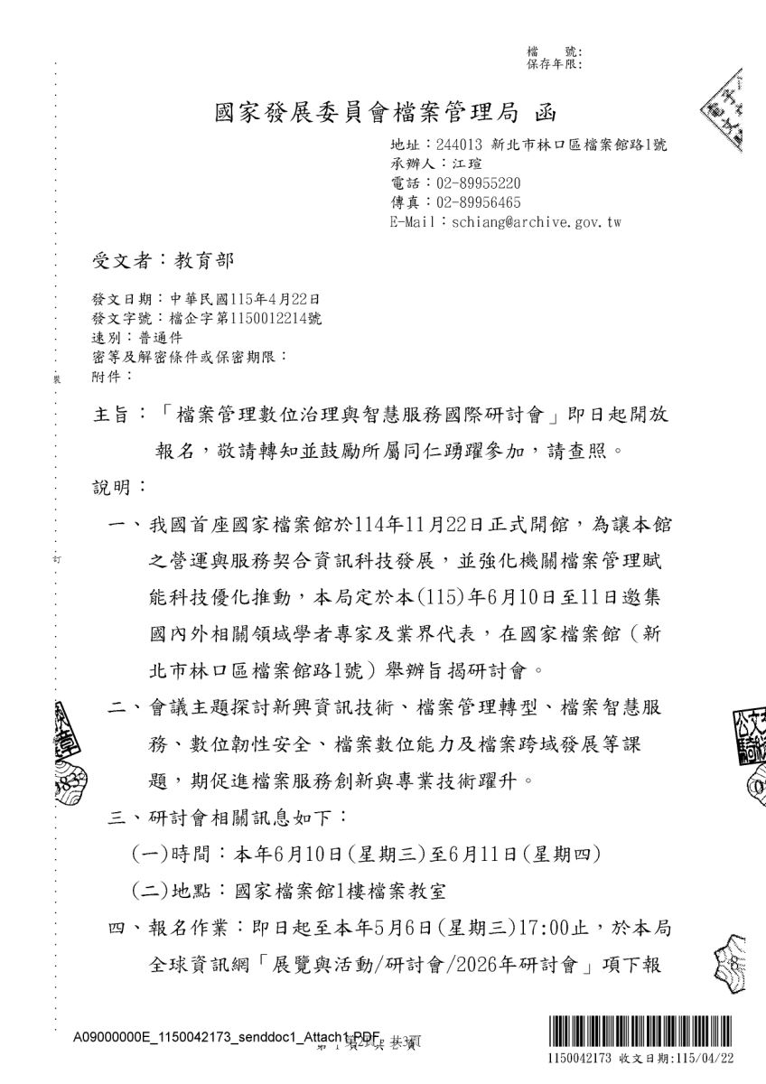 主旨:函轉國家發展委員會檔案管理局於115年6月10日至11日舉辦「檔案管理數位治理與智慧服務國際研討會」。